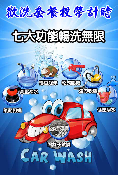 乾式:打蠟、風槍、軟水吸塵、光隧道照明、電風扇、內飾除異味、歡洗套餐