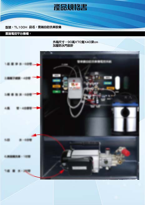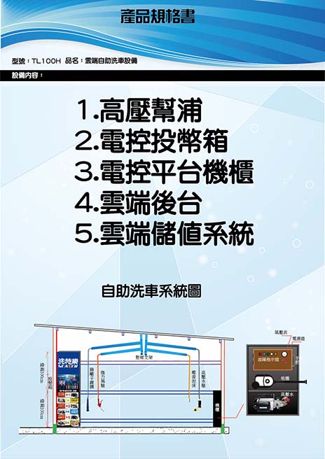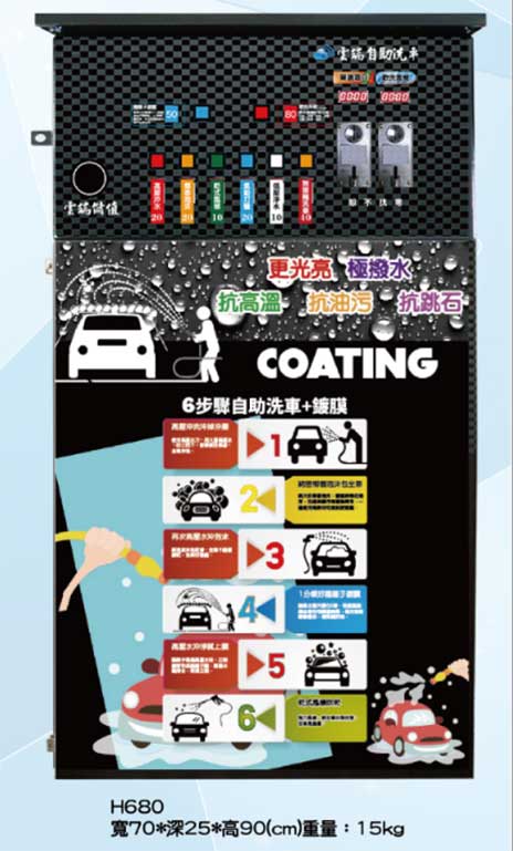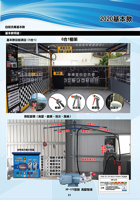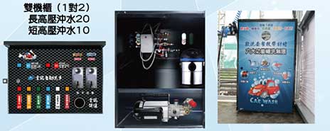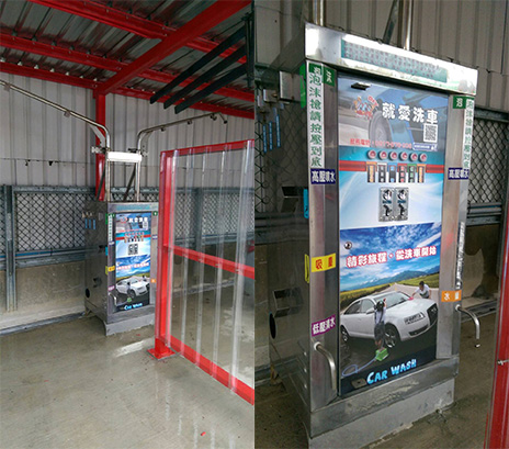 針對洗車場開發之單機式洗車機,多種電控功能,可客制化程式,噴灑細緻,覆蓋全車均勻,機器穩定,出量綿密,用量很省,一台電控機可供兩個車位使用。