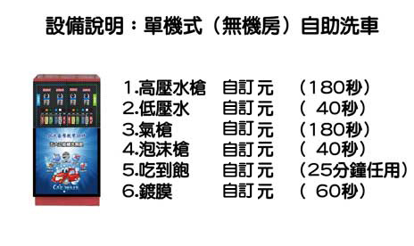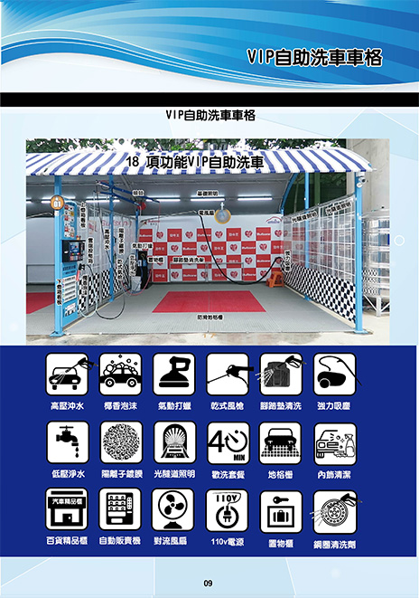 計時暢洗:高壓,泡沫,氣槍,低壓水,吸塵,光隧道照明,臭氧機循環,氣動打蠟
